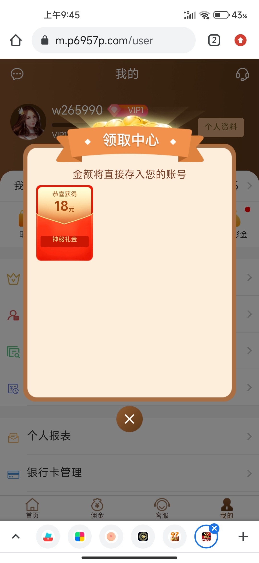 部分老用户登录我的-领取彩金里领取回馈18元,没有的无视