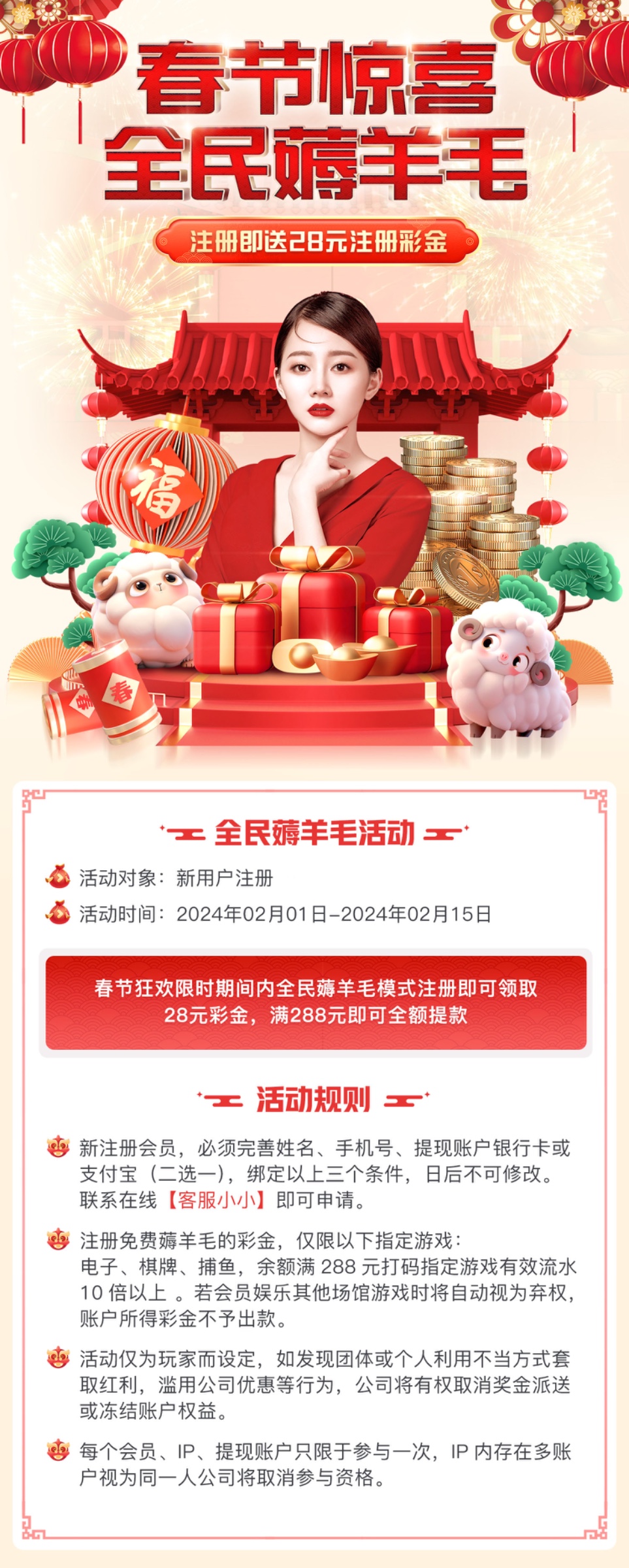 春节狂欢限时期间内全民薅羊毛模式注册即可领取28元彩金,满288元即可全额提款!