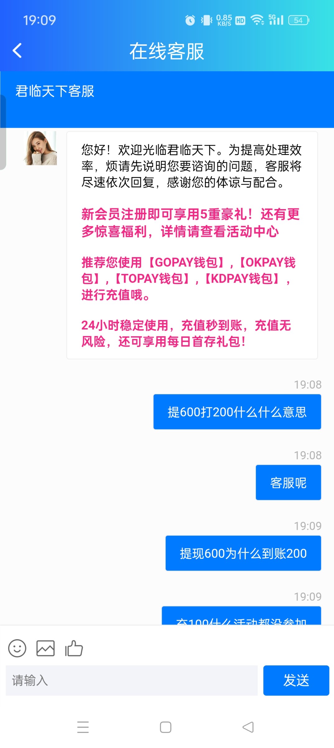 充一百什么活动都没参加,提六百到账两百。千万别充值