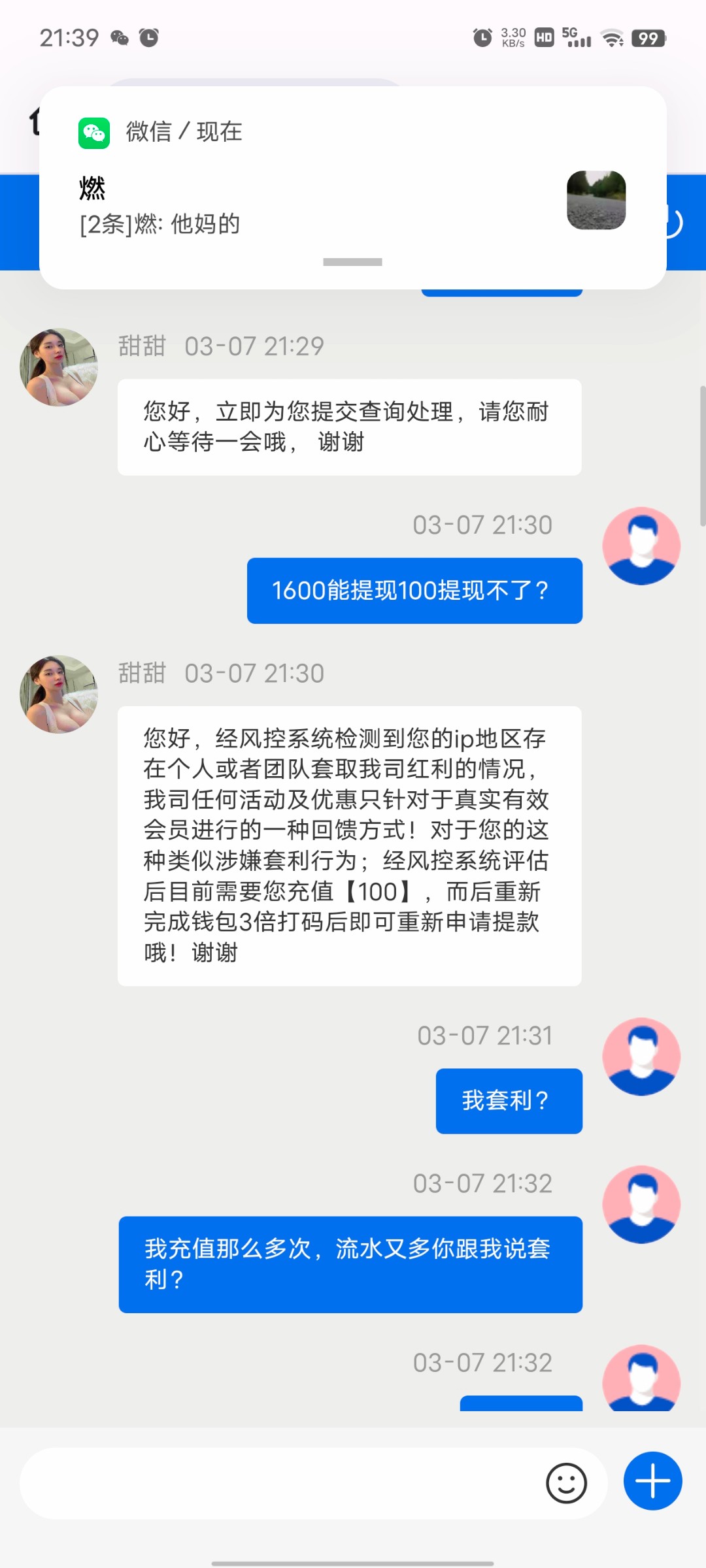 你搞什么飞机啊牢弟 7号你没有充值 7号你是不是签到了 签到了的话 这些签到台客服会认为你套利了啊 签到台只能白嫖出款一次 你昨天6号充值肯定给你出款啊
