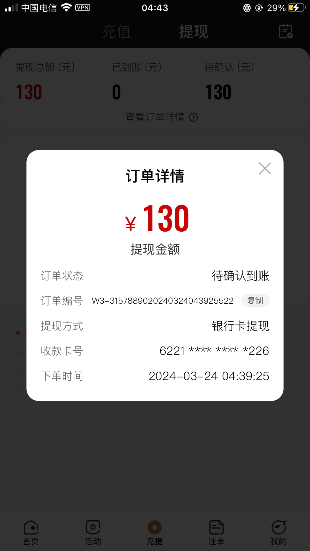 一点格局都没送了58打电话给我的然后打到两百不给提现叫我充值同样钱才能提现估计黑