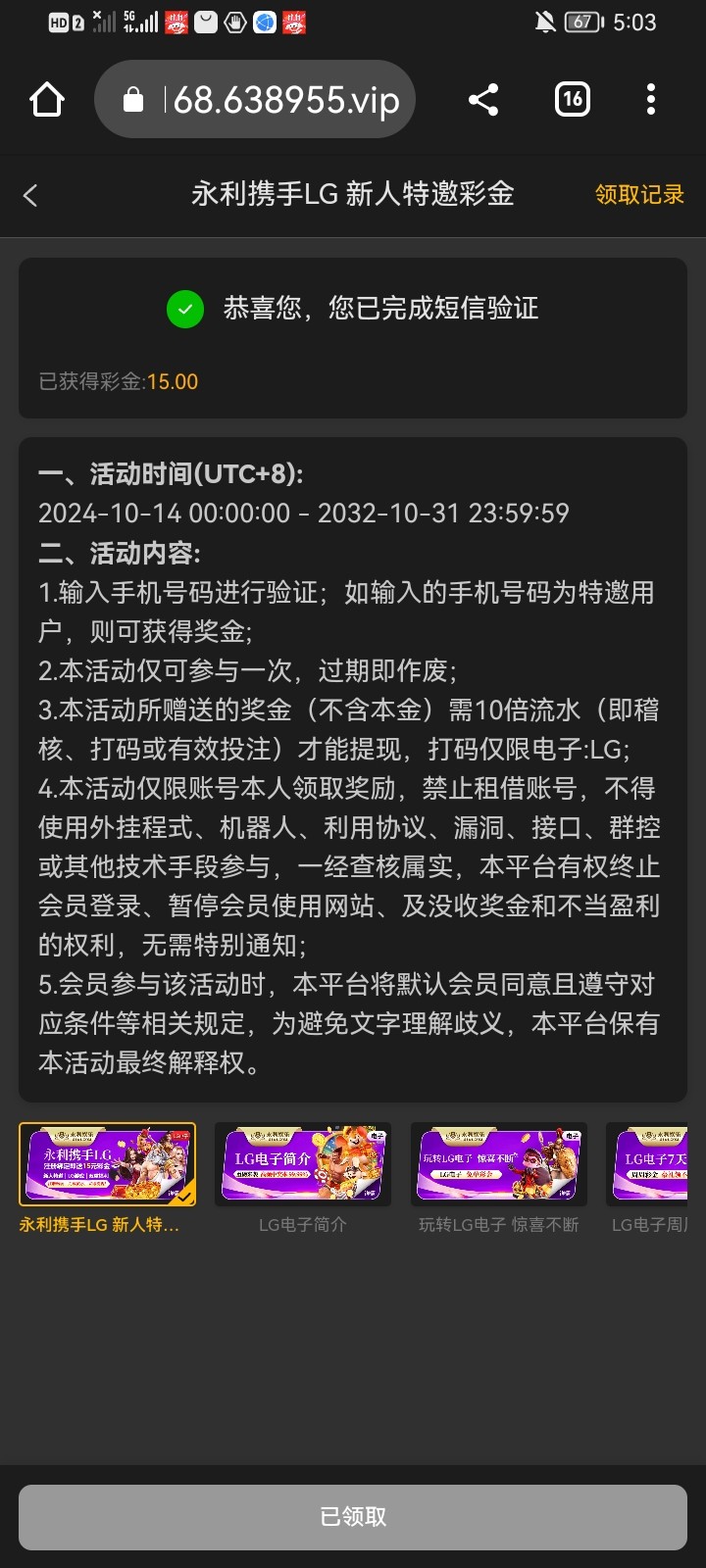 自己看一下有没有收到短信,收到的点优惠活动新人彩金,填手机号可以领15,感觉没有水,打不出来