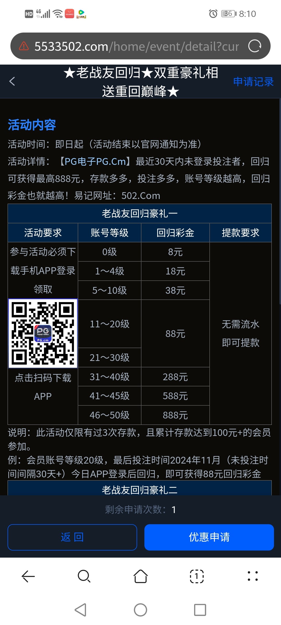 这个台子基本都注册过都有账号,登录账号说是30天未登录投注过最低送8,本人没充值过,今天闲着无聊找到这个进去申请秒到8,不过没打出来,你们去试试吧!打出来的反遗一下!