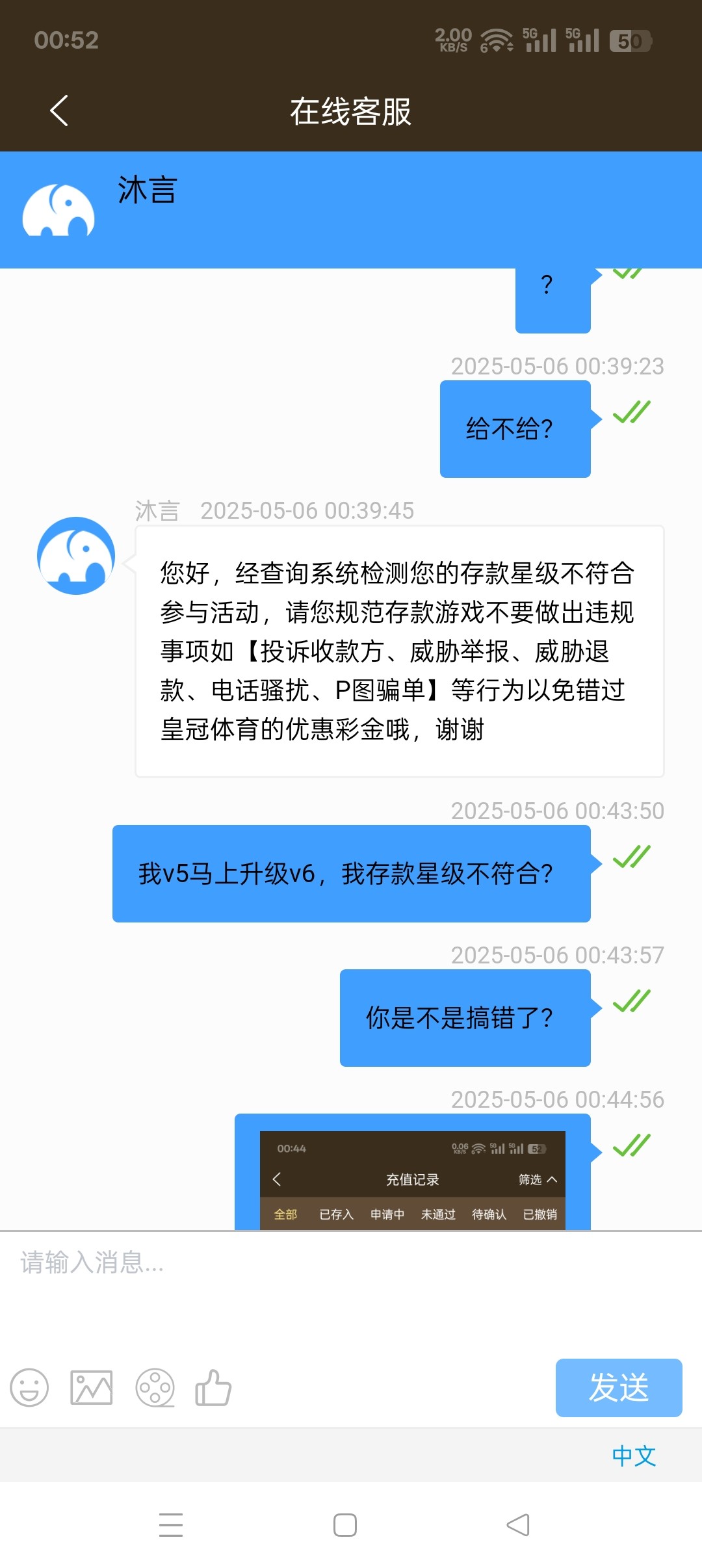 一号就开始说五号之前派送,我今天联系了五个客服,第一个客服说我账号异常,异常送了别的五一彩金?第二个客服说无法查询,那么第一个客服怎么查出的异常?第三个客服说我账号正常符合派送五一历史回馈彩金,第四个客服说符合派送在12点之前没派送再联系客服,第五个客服先说三十分钟内派送,再说一个小时内派送,然后又说今天没派送明天咨询?