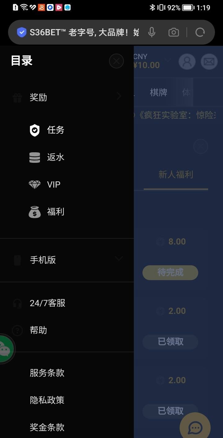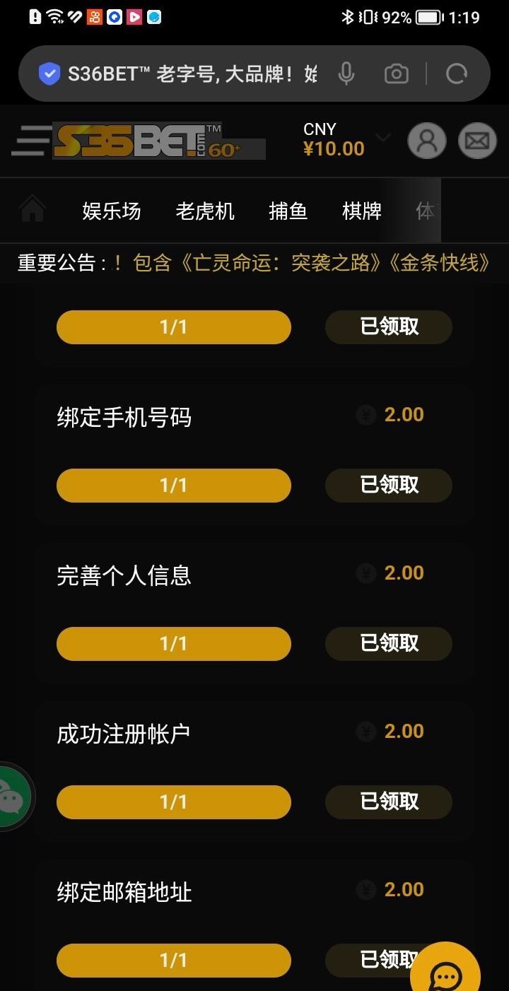 链接s36bet.com 邮箱注册 在左上角三条杠点进去任务 然后新人 然后绑定收款方式 可以usdt 名字 什么的 然后就可以领取8 绑定手机号再加2  可以邮箱领取一个号 手机号再注册一个 绑定u刷新一下就可以领取  我打了2个号 真人一把没