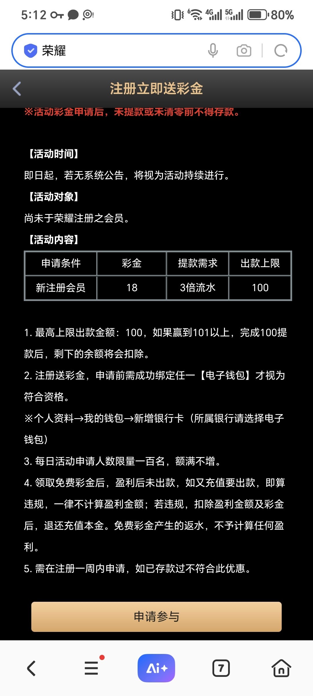 活动里绑定信息还有电子钱包,自助申请,每天限量。不知道查不查手机,我绑银行卡找客服没过审核,应该还可以申请,可以试试