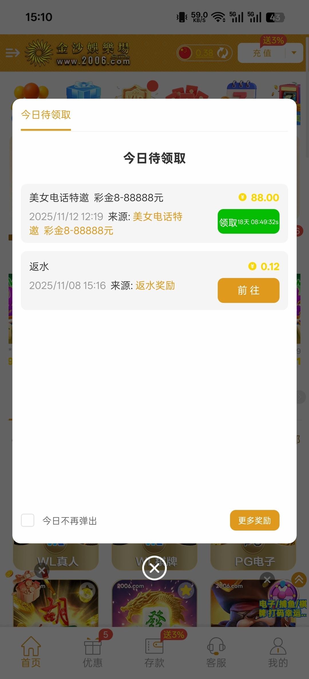 今天登录上去发现有88电话彩金老用户去看看