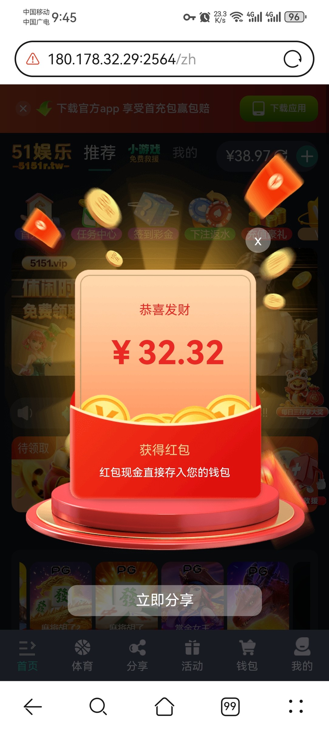 点:注册下载 就能打开网站,自己斟酌撸款白嫖,我打了20几个号,出了一个1200一个600,清除浏览器数据换ip重新撸,点签到宝箱没提示“ip已签到”就能继续干,还有出款不要出同名,找朋友拿支付下