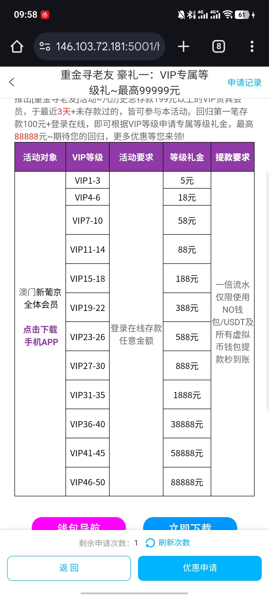 之前打过1+1的 有号的可以去申请 回归彩金 还有一个 TB专员彩金 可以申请