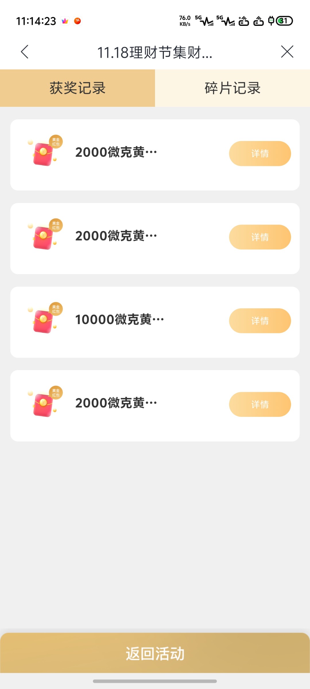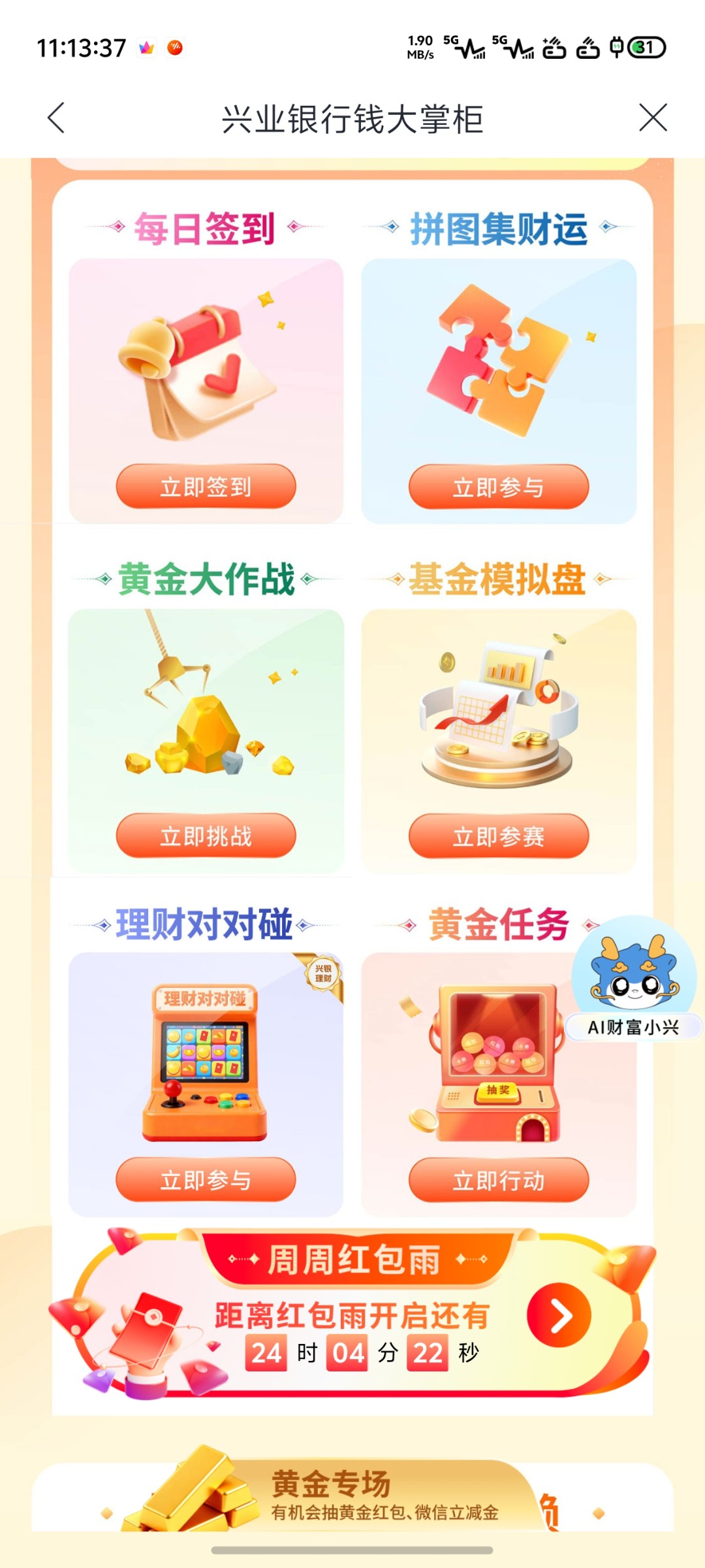 挂逼老哥可以来搞,去完成任务抽奖,能搞个几十块,打开兴业银行没有兴业银行卡也可以,打开搜索找到11.18理财节,去完成任务1000微克等于1块钱,幸运能抽到10万