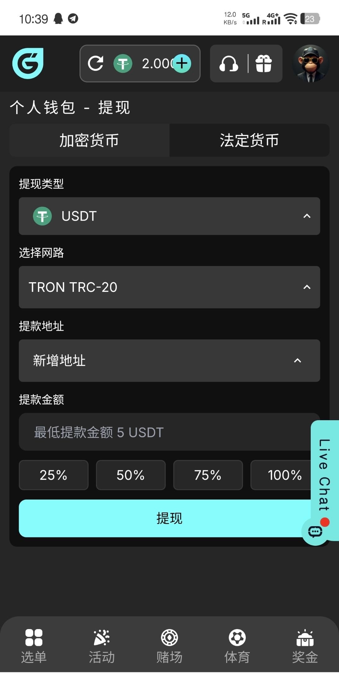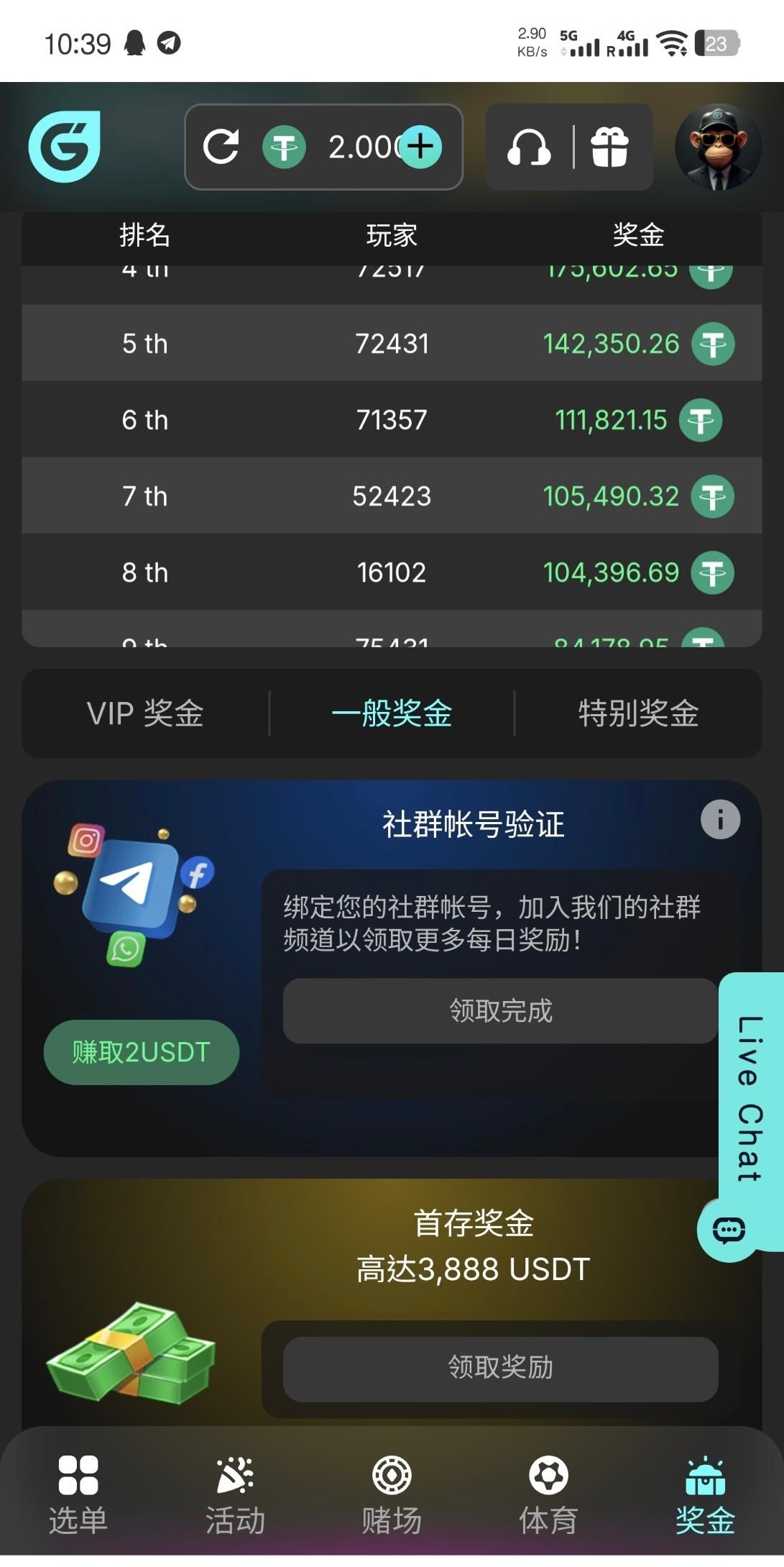 注册后在个人-奖金里找绑定社群账号的任务,3个任务完成领2U。不限场馆1倍水5U起提,我梭哈百家乐第二关没了,所以出款自测