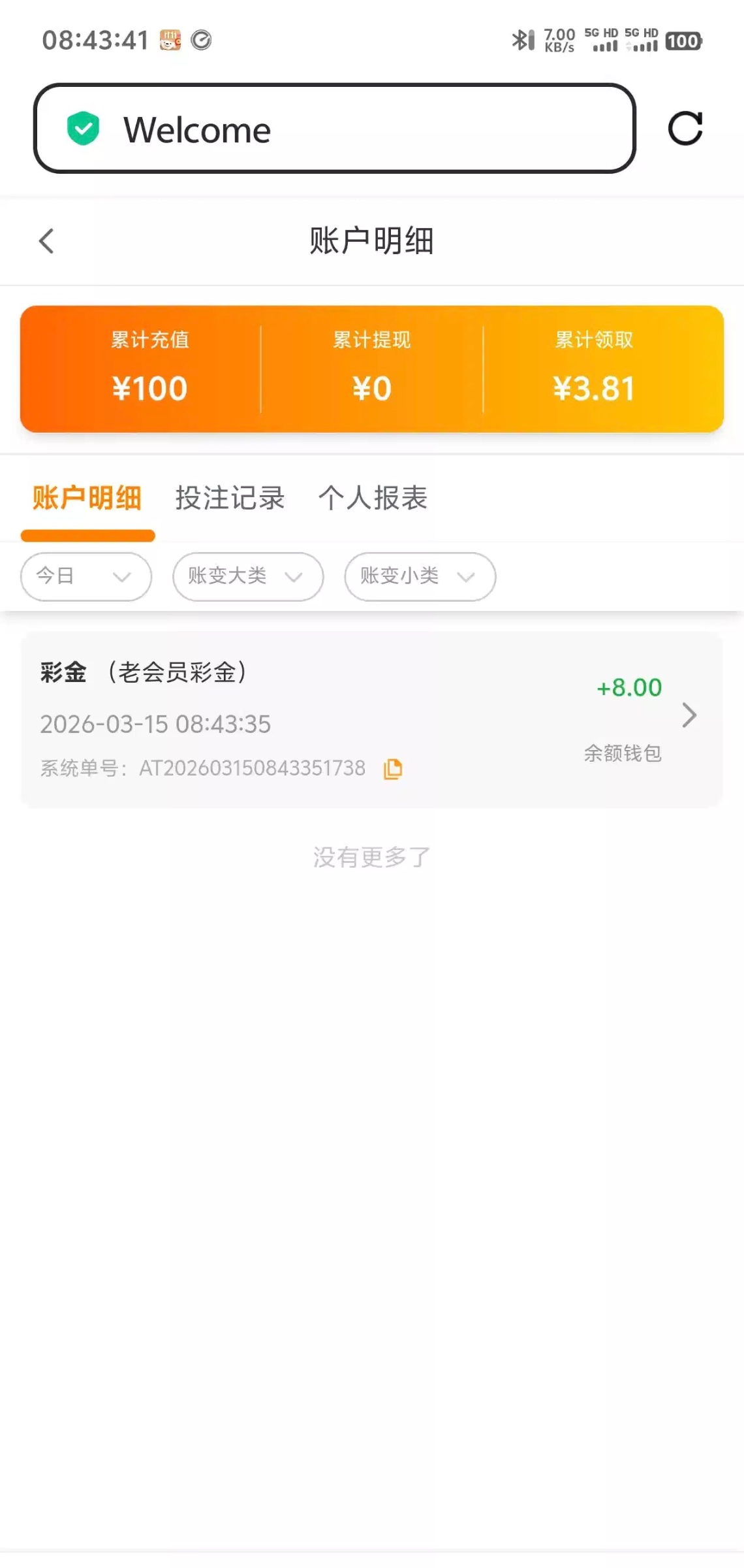 登陆账号看到送了8彩金,有账号的可以看看,之前充值过100,5092.com