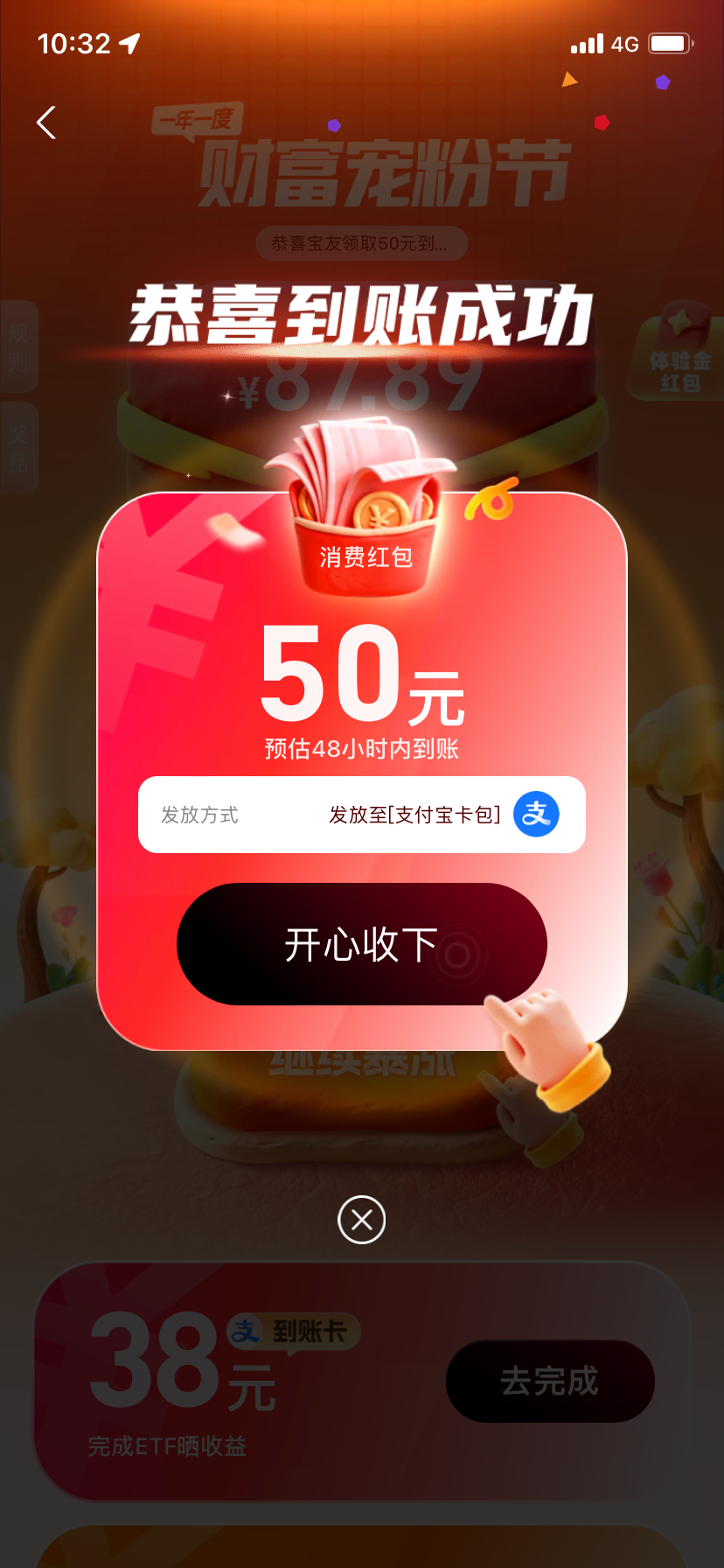 支付宝搜财富宠粉节,随便填几个资料,绑一类卡,接个电话,就问两句话,十秒钟结束,直接送50,,前几天申请的,电话被拦截了,今天送了
