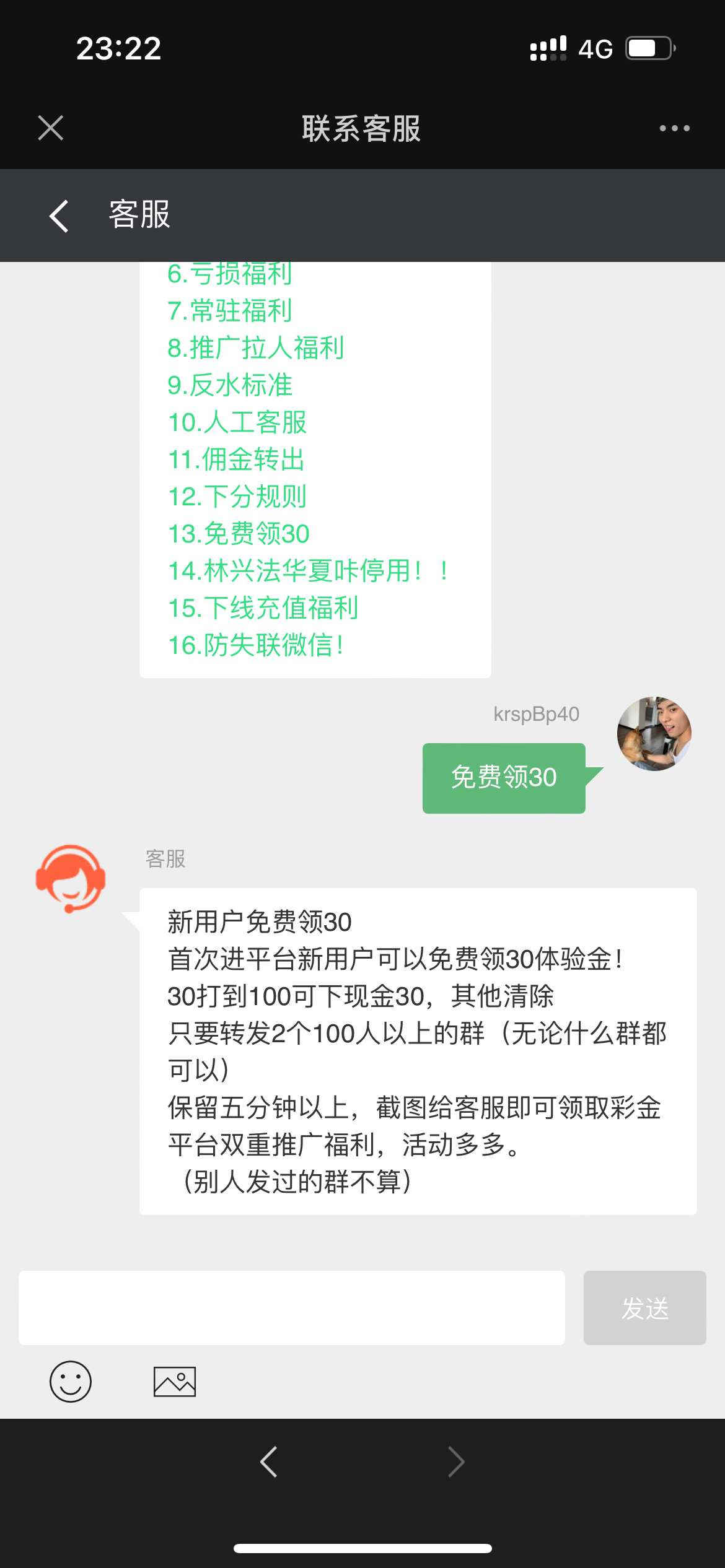 新用户微信扫码进平台找客服要活动图 随便找两个群发一下 打到100可下30 可以换小号无限撸不查IP